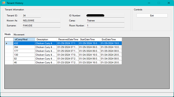 Movement - Displays the movement history of the current tenant
