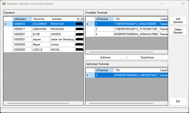 Opens the window that allows adding, deleting, authorizing and deauthorizing of terminal operators